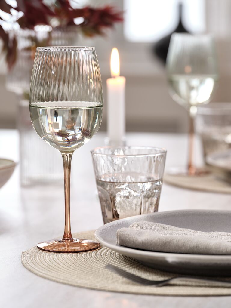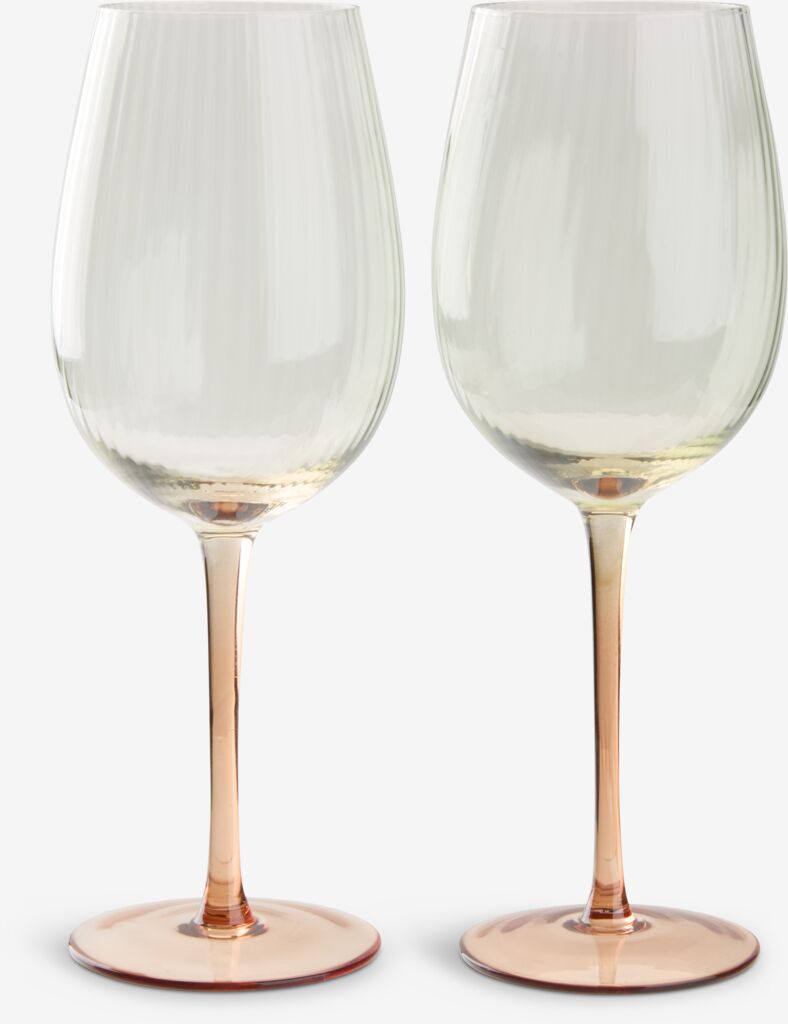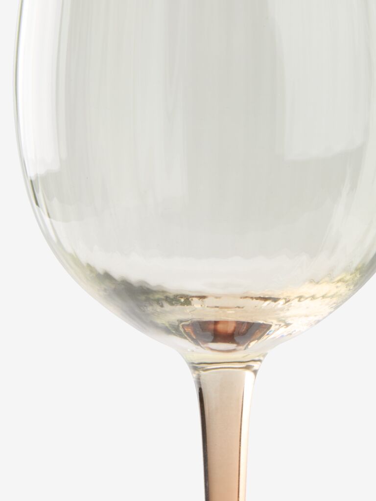 Juego de 2 copas de vino hechas de cristal (50% reciclado). Estas copas tienen un diseño clásico con un tallo de color dorado rosado y elegantes detalles acanalados. Lucirán magníficamente en una mesa decorada de forma festiva. Capacidad de 40 cl. A23 cm