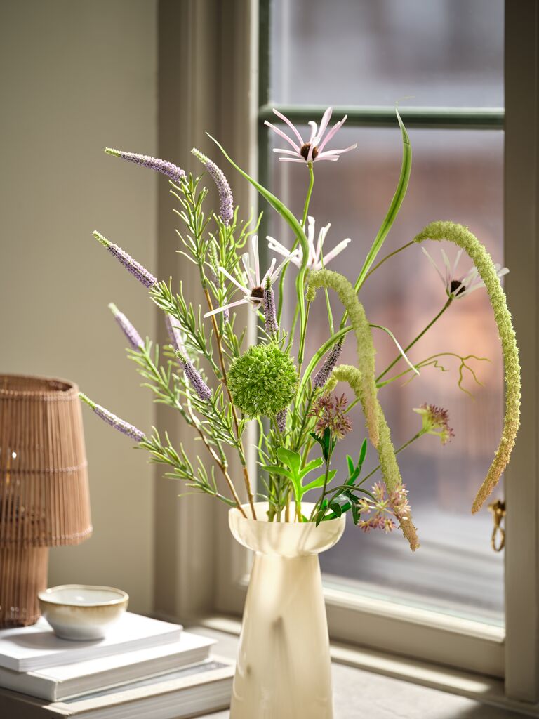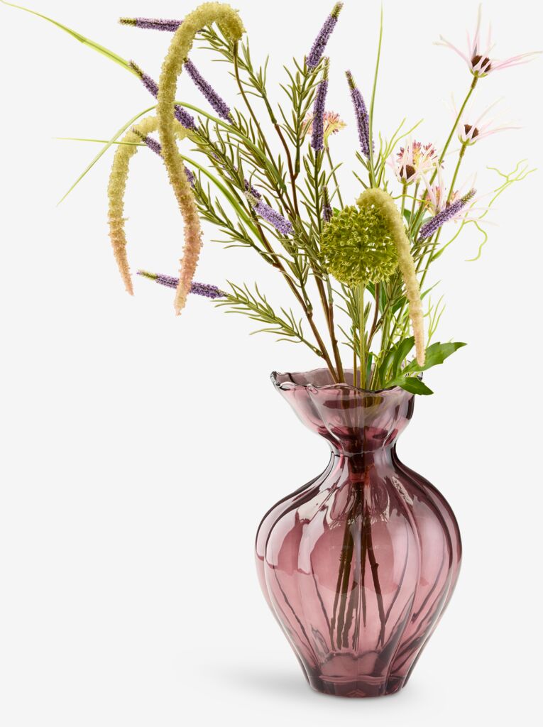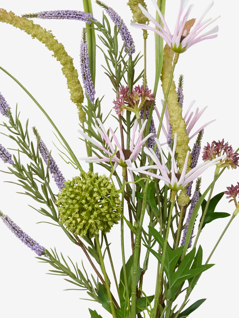 Ramo artificial que captura el aspecto de un arreglo floral silvestre natural. Ofrece una belleza duradera sin necesidad de mantenimiento, lo cual permite disfrutar de un toque fresco y botánico en tu hogar durante todo el año. A70 cm
