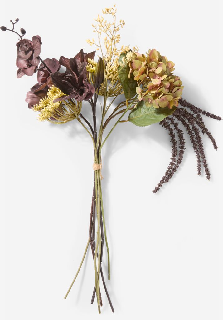 Ramo artificial con un surtido realista de flores y follaje en tonos morado oscuro y verde. Este arreglo ofrece el atractivo visual de las flores frescas sin necesidad de mantenimiento, lo que lo convierte en una pieza decorativa sencilla y duradera. A35 x L18 x A70 cm