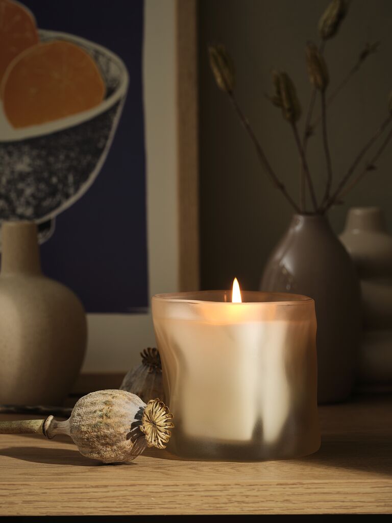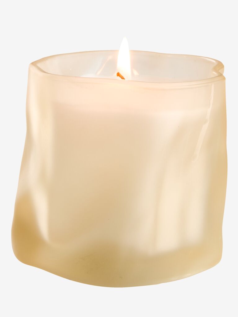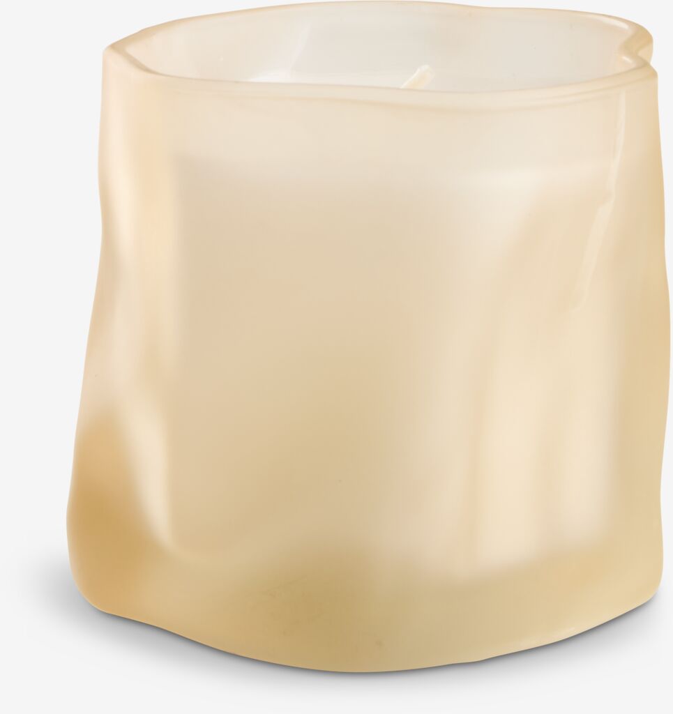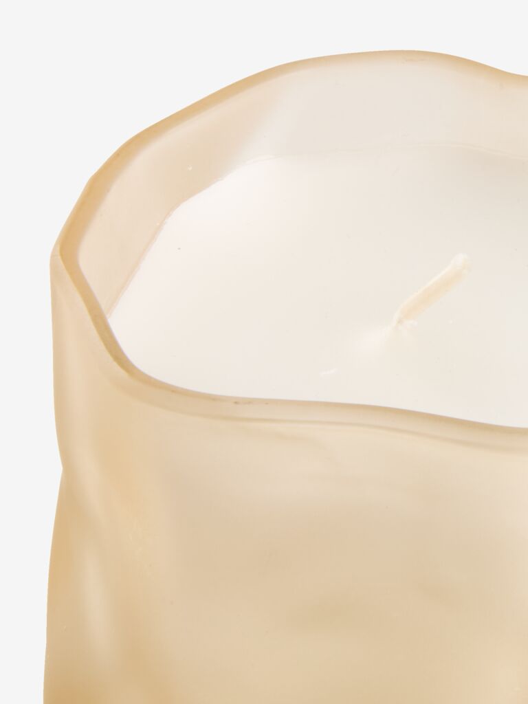 Vela aromática en un recipiente de cristal beis con un diseño ondulado y moderno. Esta vela proporciona un aroma relajante en tu hogar, con un tiempo de iluminación que llega a las 15 horas. Ø8 x A8 cm