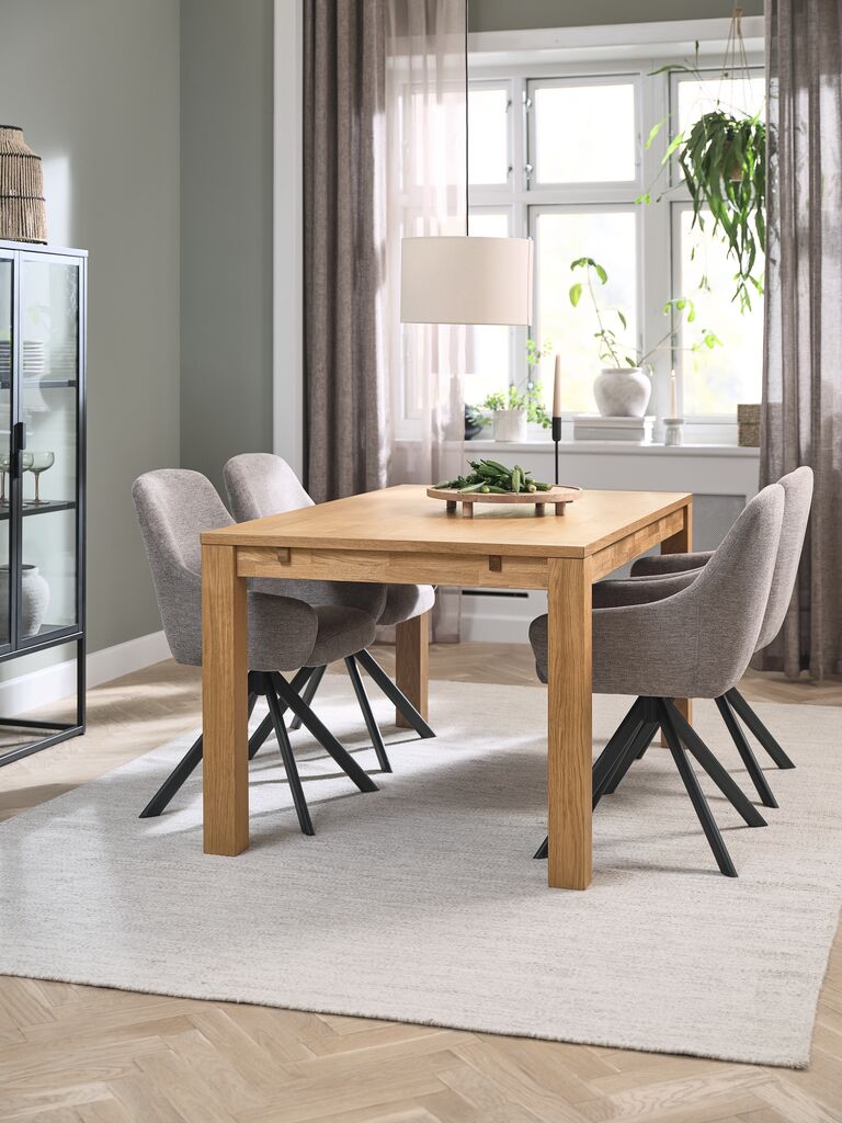 Mesa: Roble macizo y chapa de roble. No incluye extensiones. A90 x L150 x A76 cm. Silla: Tela. Con base giratoria de acero.