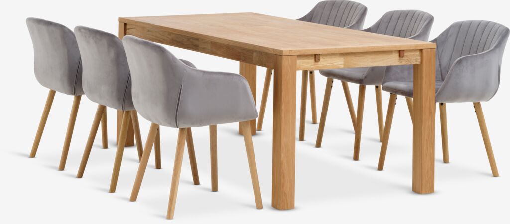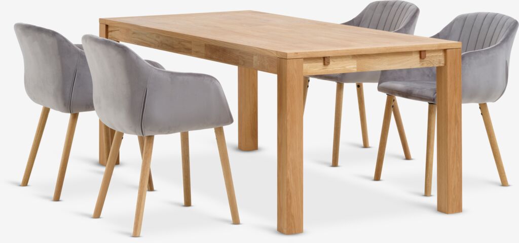 HAGE + ADSLEVMesa HAGE L190 roble natural+4 sillas ADSLEV terciopelo gris