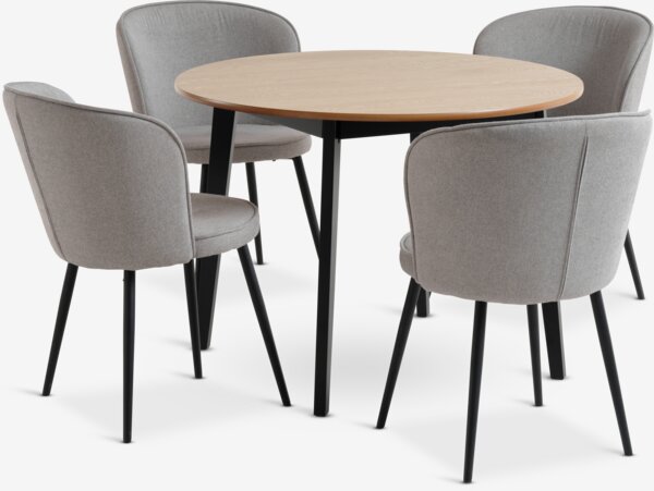 JEGIND + RISSKOVMesa JEGIND Ø105 roble/negro + 4 sillas RISSKOV gris claro