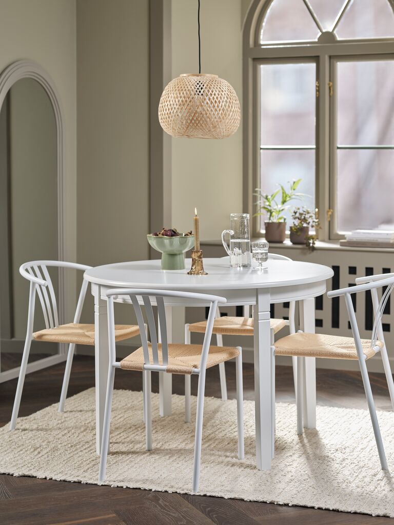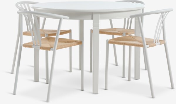 KIRKEBY + GUDERUPMesa KIRKEBY Ø110 blanco + 4 sillas JYDERUP blanco/natural