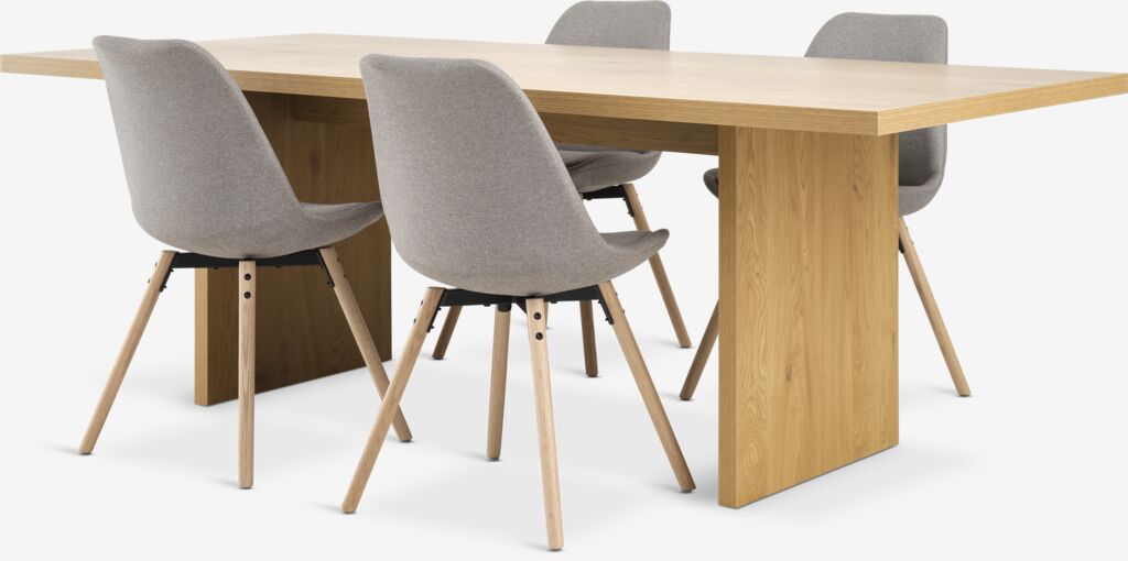 MUNKEBY + KASTRUPMesa MUNKEBY L220 roble cálido + 4 sillas KASTRUP arena