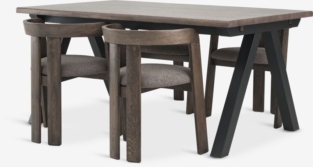 Mesa: Madera maciza y chapa de roble. No incluye extensiones. A100 x L160 x A75 cm. Silla: Tela y roble macizo.