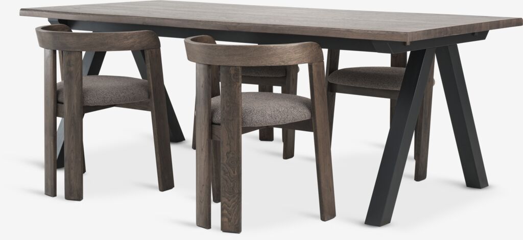 Mesa: Madera maciza y chapa de roble. No incluye extensiones. A100 x L210 x A75 cm. Silla: Tela y roble macizo.