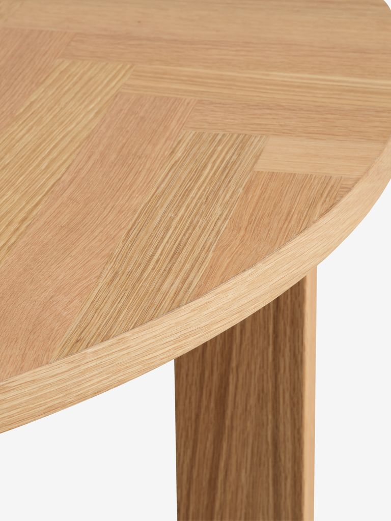 Mesa de comedor redonda con tablero de chapa de roble y patas de roble macizo y chapa de roble. El tablero tiene un elegante diseño de espina de pez. Ø129 x A75 cm
