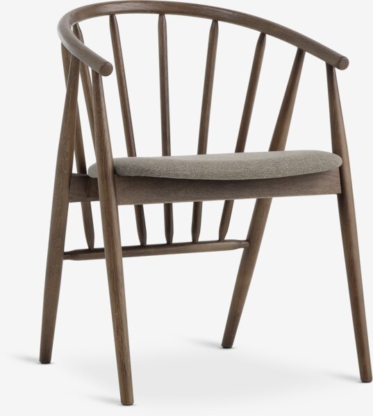 Silla de comedor con reposabrazos que proporcionan comodidad y apoyo añadido. Silla con asiento acolchado de tela de color arena oscuro. Estructura de roble macizo oscuro con respaldo curvado.