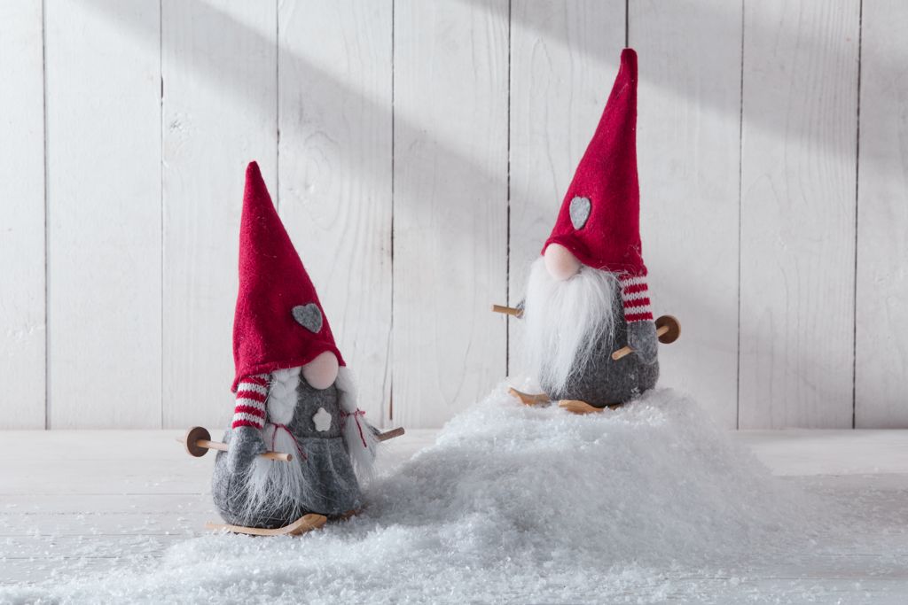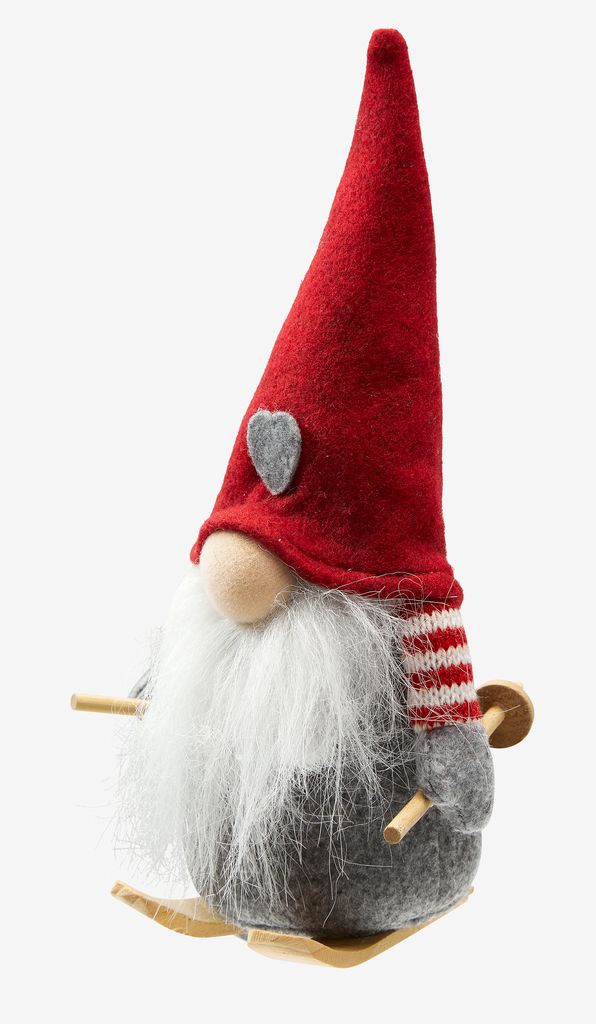 Duende de Navidad en los colores clásicos gris y rojo, con un alto gorro rojo adornado con un corazón. Se alza sobre unos esquís de madera, añadiendo un toque divertido a tu hogar. Disponible en varios modelos. A11 x L9 x A23 cm