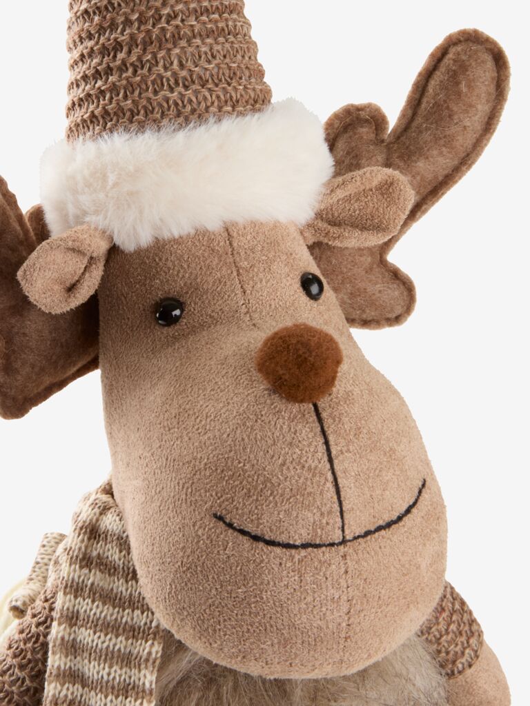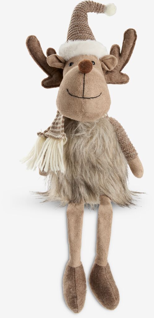 Tierno reno en colores marrón y beis con una bufanda y un gorro de Papá Noel. Diseñado para colocarlo sentado con las patas colgando sobre un estante. Un bonito elemento para la decoración navideña en el hogar. A18-23 x L14 x A40-60 cm