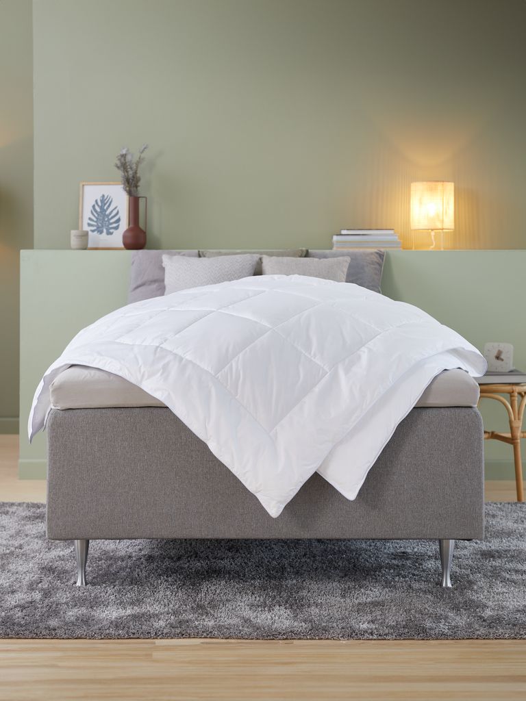 Relleno nórdico de fibra 240x220 cm, con un relleno único de plumón de fibra siliconada con aspecto de plumón, 1150 g. El plumón de fibra, suave y ligero, mantiene su volumen. Funda 100% algodón. Lavable a 60°C.