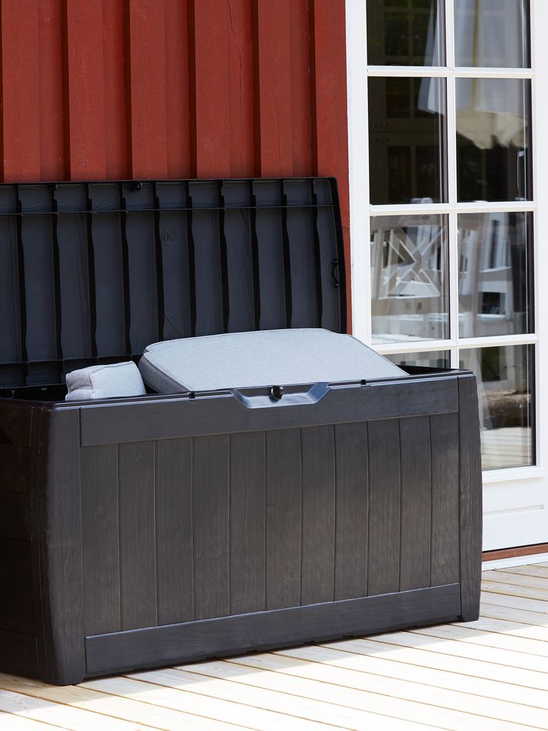 Baúl para guardar cojines, de plástico impermeable y protegido contra rayos UV (30% reciclado). Con tirador. A prueba de heladas. A117 x A58 x P45 cm