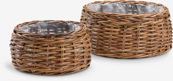 Cesto de jardín en un juego de dos, tejido con kubu natural y ratán para un aspecto rústico y texturizado. Cada cesto incluye un práctico forro de plástico para sujetar las plantas. Ø41/30 x A23/20 cm
