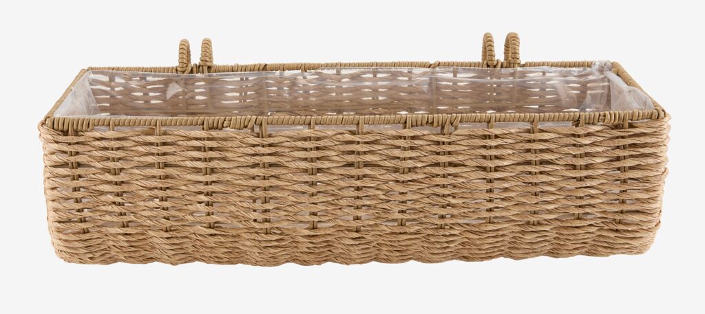 Jardinera para balcón con un diseño de ratán sintético trenzado de color natural. Tiene una estructura de acero con pintura en polvo y está hecha de materiales resistentes a las heladas, por lo cual es una opción duradera para añadir flores y plantas a tu zona de exterior. A18 x L50 x A16 cm