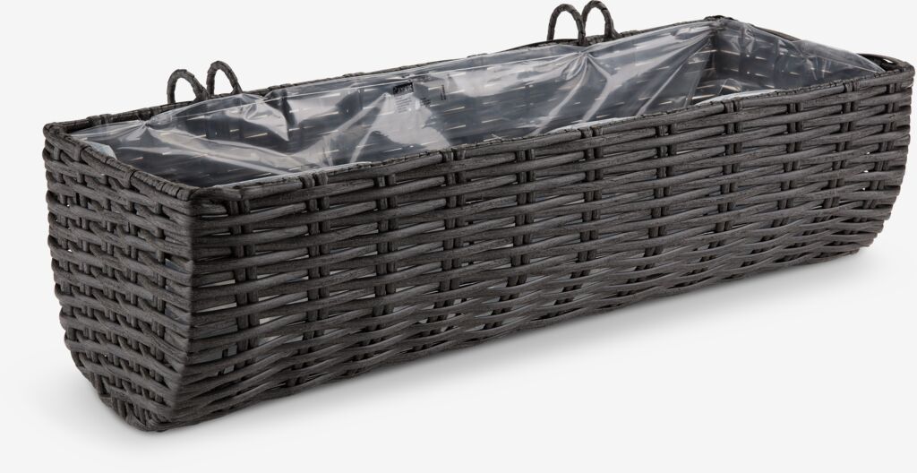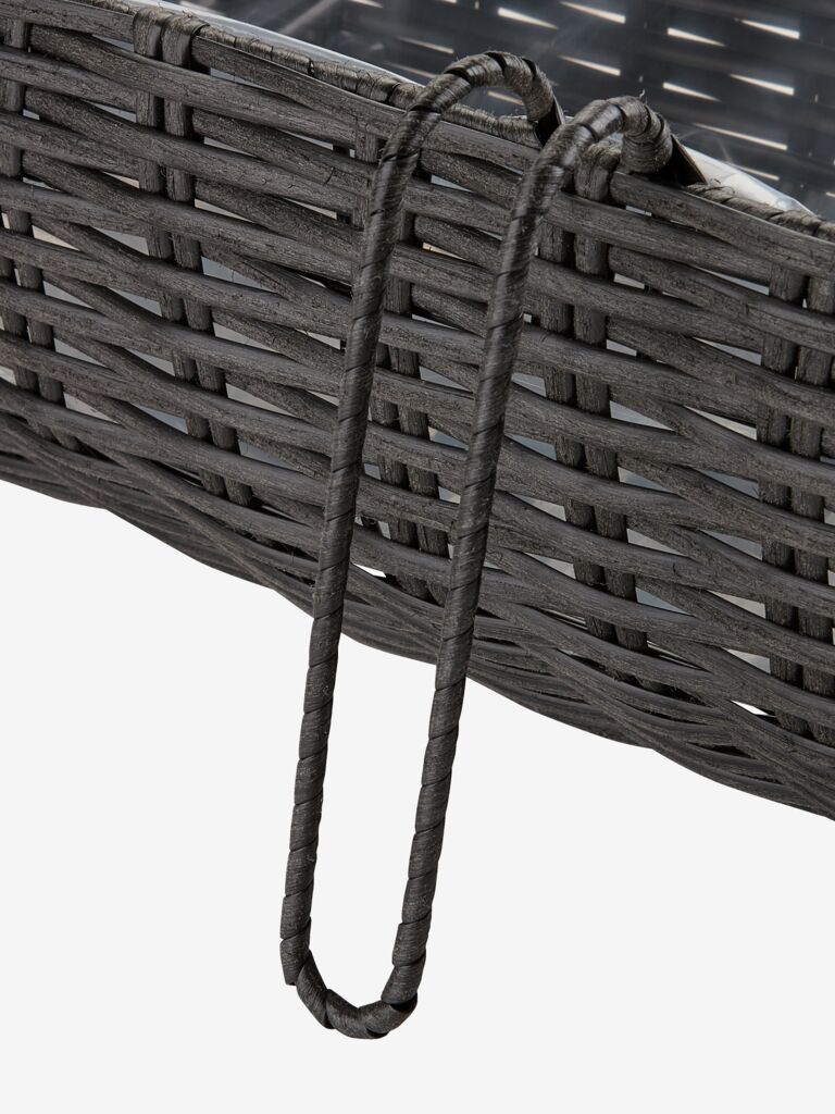 Jardinera para balcón con un diseño de ratán sintético trenzado de color negro. Tiene una estructura de acero con pintura en polvo y está hecha de materiales resistentes a las heladas, por lo cual es una opción duradera para añadir flores y plantas a tu zona de exterior. A18 x L50 x A16 cm