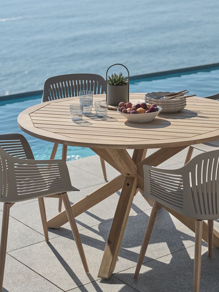 Mesa de jardín redonda de madera dura FSC® aceitada. La madera resistente se trata con aceite para protegerla y resaltar su color natural. Se recomienda seguir aceitando la madera de forma habitual, para mantener su color y protegerla de la humedad. Ø126 x A75 cm