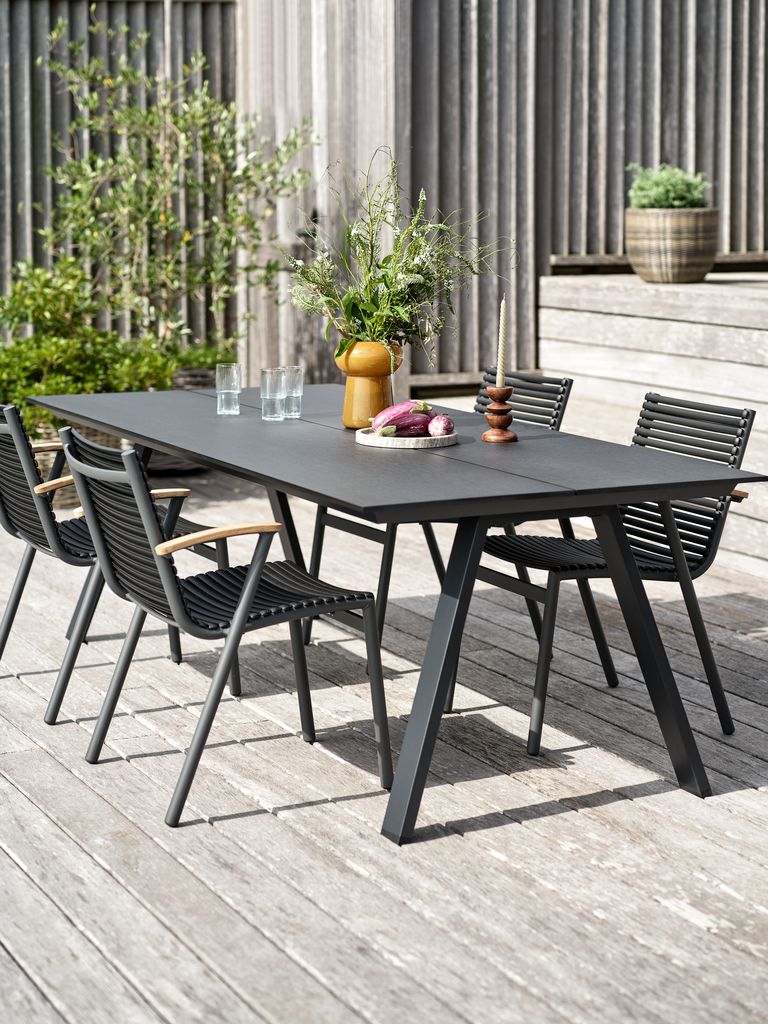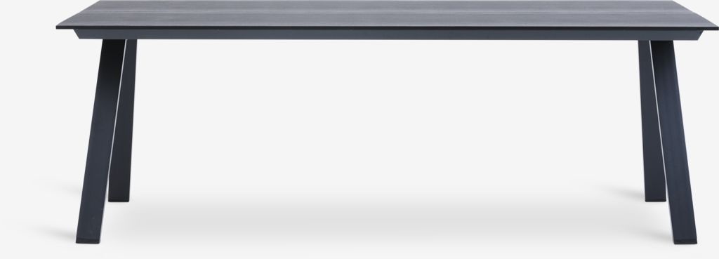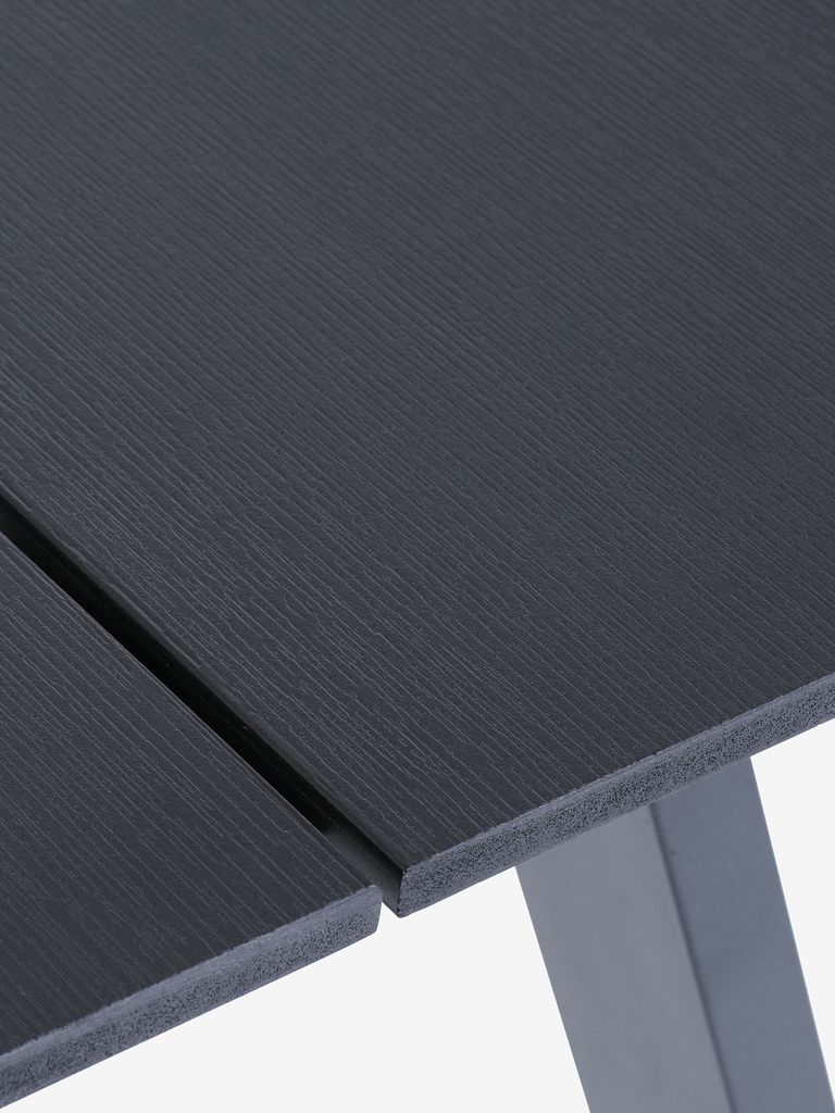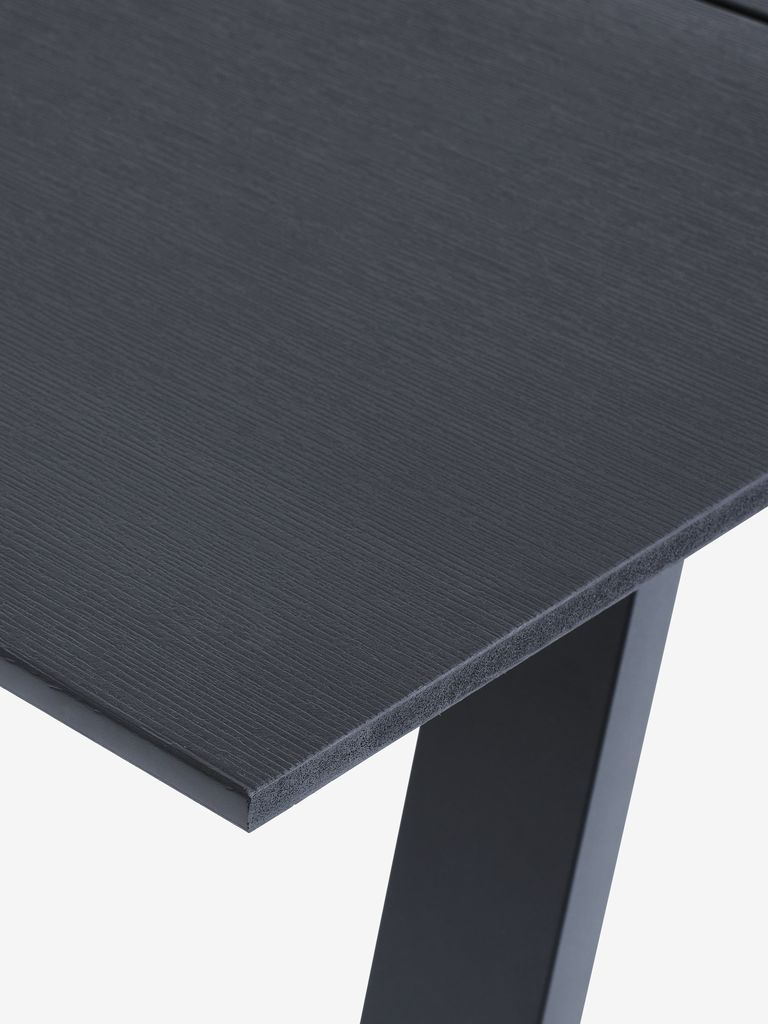 Mesa de jardín de color negro, con tablero de madera artificial. Estructura y patas de aluminio con pintura en polvo. La madera artificial tiene el aspecto y la textura de la madera natural, sin necesidad de mantenimiento. El aluminio es un material robusto y ligero que no se oxida. A100 x L220 x A74 cm