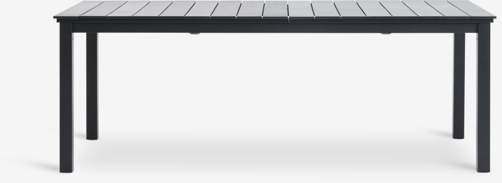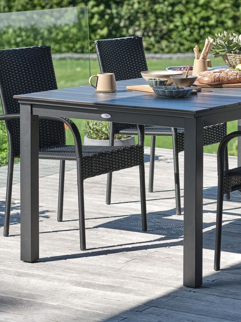 Mesa de jardín extensible con mecanismo de extracción. Incluye 2 extensiones de mesa, que se pueden guardar bajo el tablero. Esta mesa de jardín tiene un tablero de color gris de madera compuesta DURAWOOD®. Estructura y patas a juego, de aluminio con pintura en polvo. DURAWOOD® es un material compuesto resistente que consiste en fibras de madera dura FSC® y plástico. Tiene el aspecto y la textura de la madera natural, sin necesidad de mantenimiento. El aluminio es un material robusto y ligero que no se oxida. Puedes alargar la mesa con facilidad a 265 o 315 cm para que quepan más personas. A95 x L214 x A77 cm