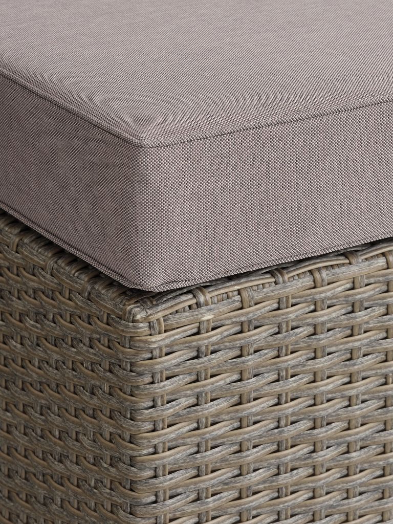 Conjunto de jardín modular de 4 plazas que incluye 5 módulos, que se pueden montar para que se adapten a tu zona de exterior. 1 mesa: Acero y madera dura FSC® aceitada. A39 x L72 x A52 cm. 2 módulos rinconeros/finales y 2 pufs: Acero y ratán sintético. Incluye cojines de calidad con funda resistente.