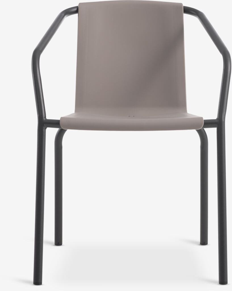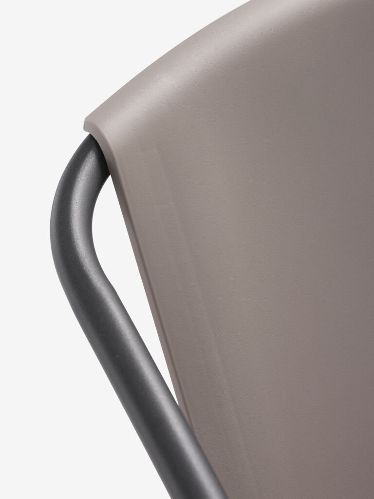 Silla apilable con asiento de plástico de color arena oscuro, y estructura de acero con pintura en polvo, de color negro. Esta silla de jardín es apilable, para un almacenaje compacto.