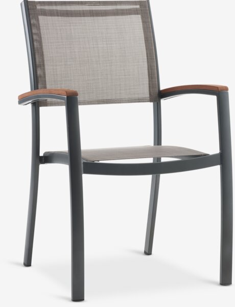 Silla apilable de color gris, con asiento y respaldo de textilene, y estructura de aluminio con pintura en polvo. Los reposabrazos tienen un acabado de madera dura FSC® aceitada que le confiere un aspecto elegante. El textilene es un material confortable y que no destiñe, se seca rápidamente y es fácil de limpiar. El aluminio es un material robusto y ligero que no se oxida. La madera resistente se trata con aceite para protegerla y resaltar su color natural. Se recomienda seguir aceitando la madera de forma habitual, para mantener su color y protegerla de la humedad. Esta silla de jardín es apilable, para un almacenaje compacto.