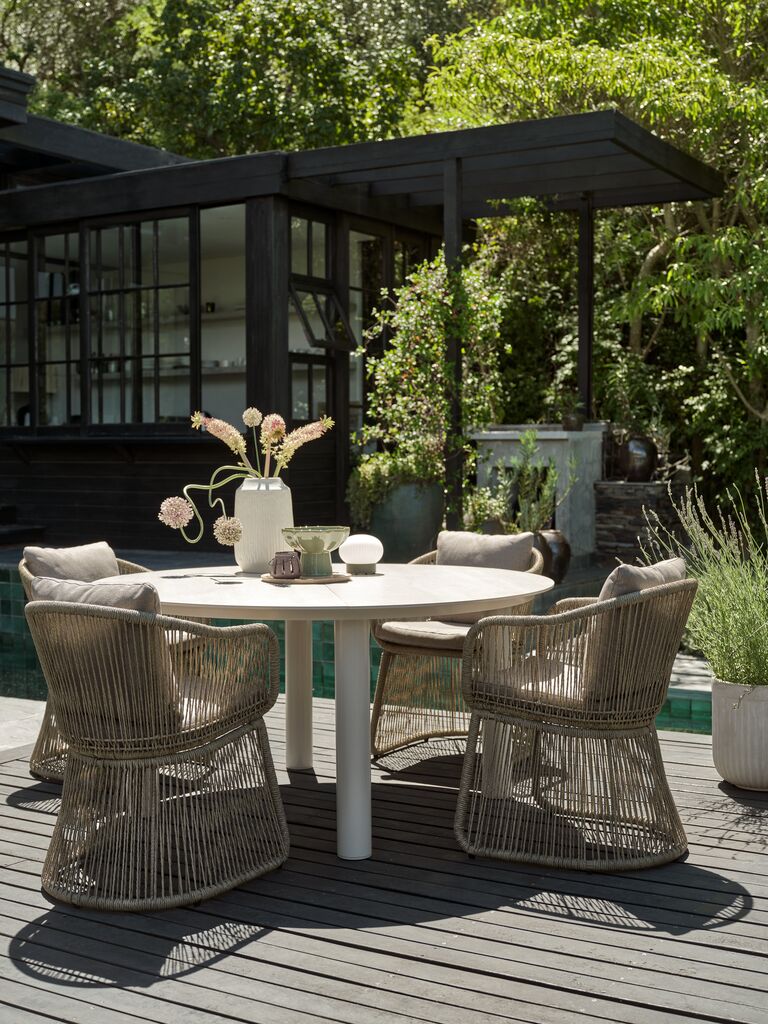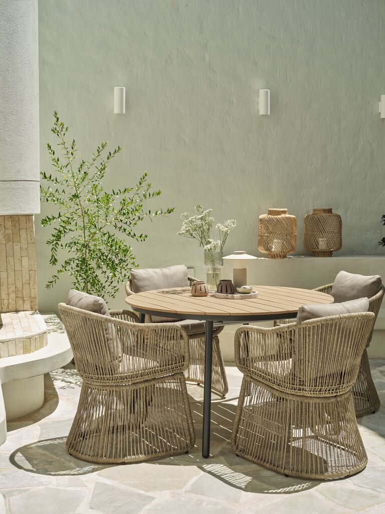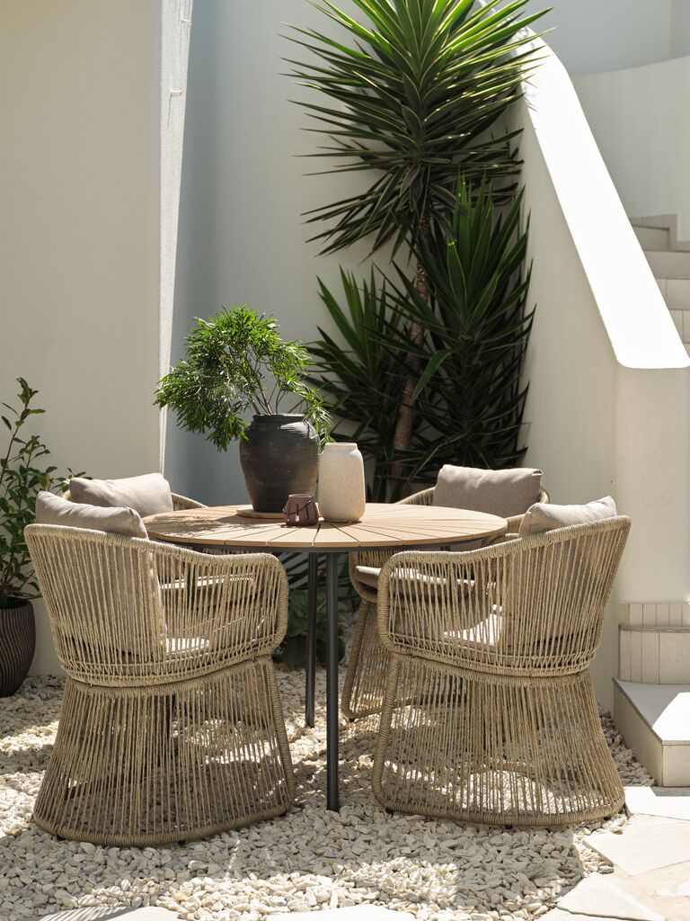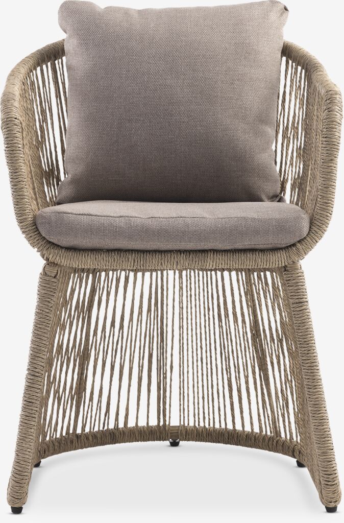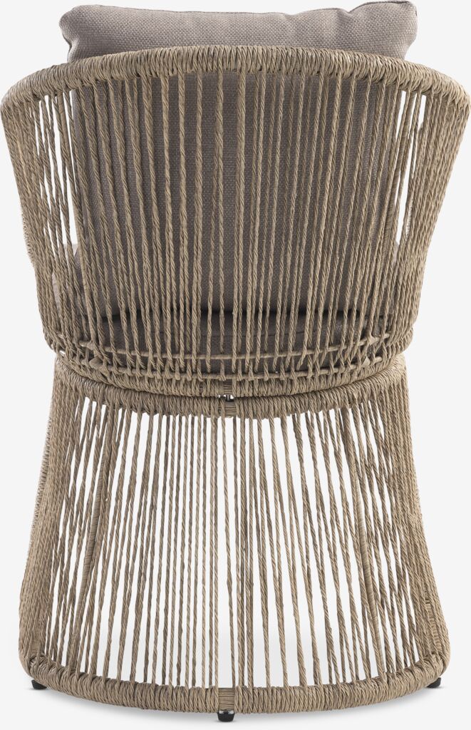 Silla de jardín de cuerda de polietileno y estructura de acero con pintura en polvo. Incluye cojines de lujo con funda resistente y tejida en estructura.