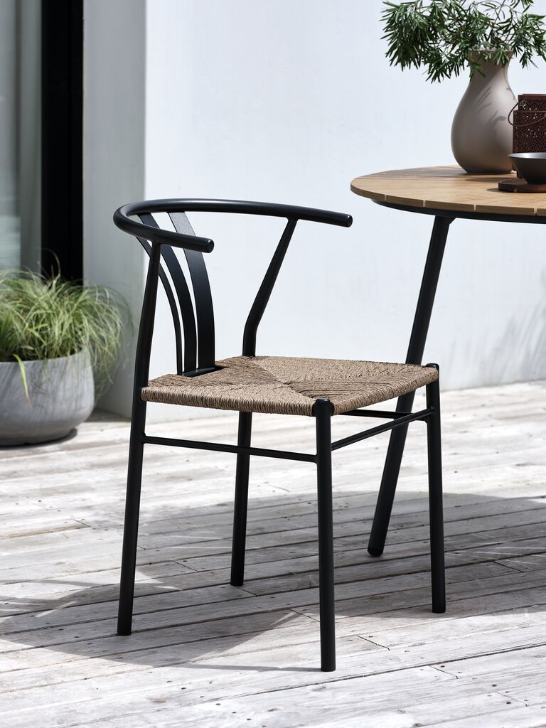 Silla de jardín con asiento de ratán sintético y estructura de aluminio con pintura en polvo, de color negro. El ratán sintético aporta un aspecto de mimbre natural, y a la vez es resistente a las inclemencias meteorológicas y no requiere mantenimiento. El aluminio es un material robusto y ligero que no se oxida.