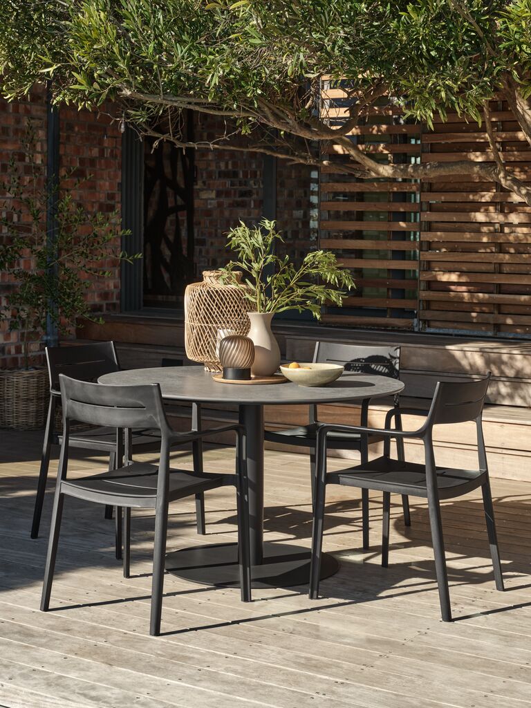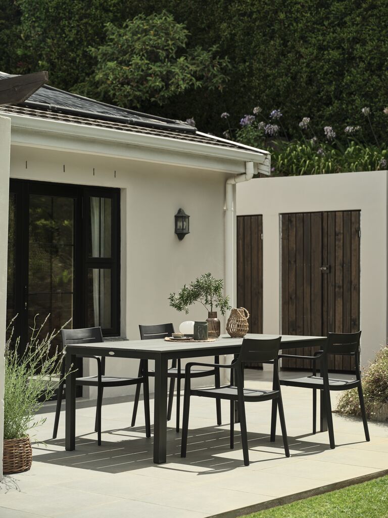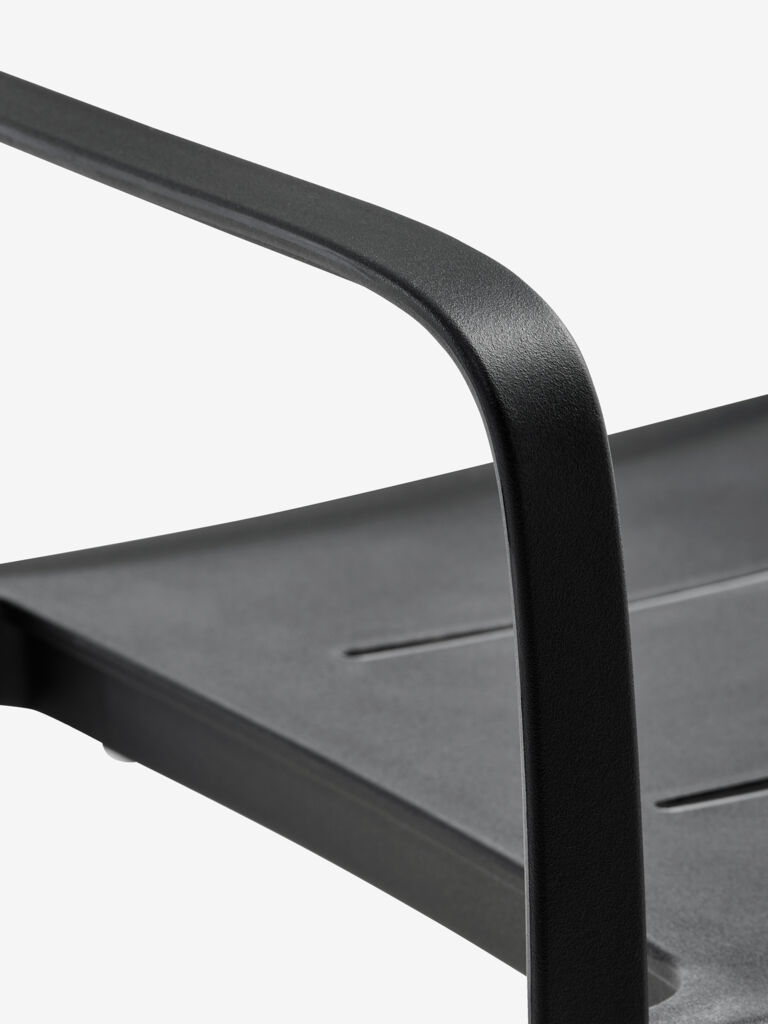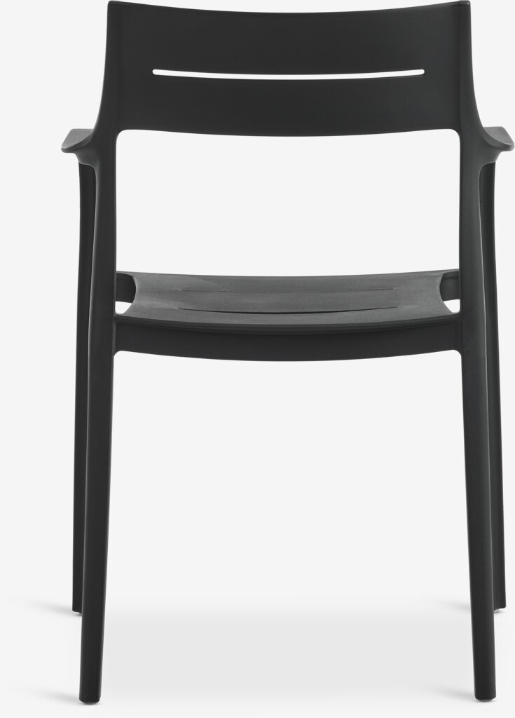 Silla apilable de color negro, de plástico (20% reciclado) protegido contra los rayos UV, lo cual contribuye a prevenir el desteñido. Esta silla de jardín es apilable, para un almacenaje compacto.