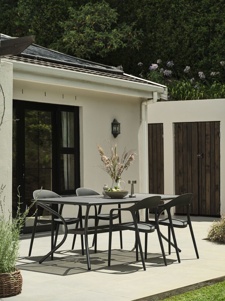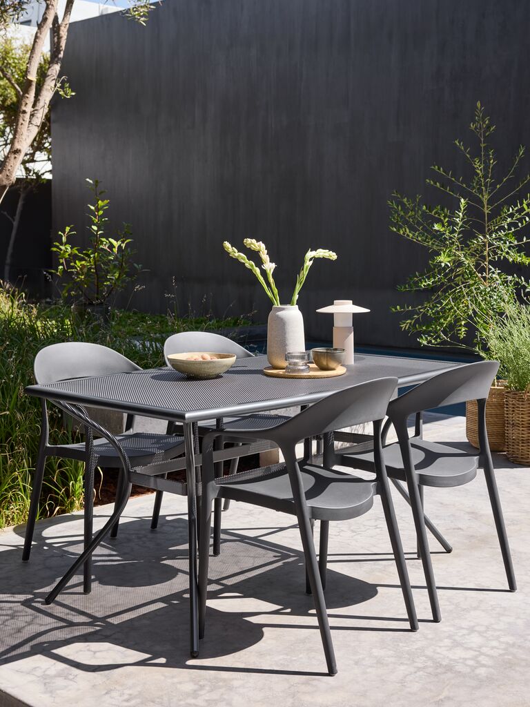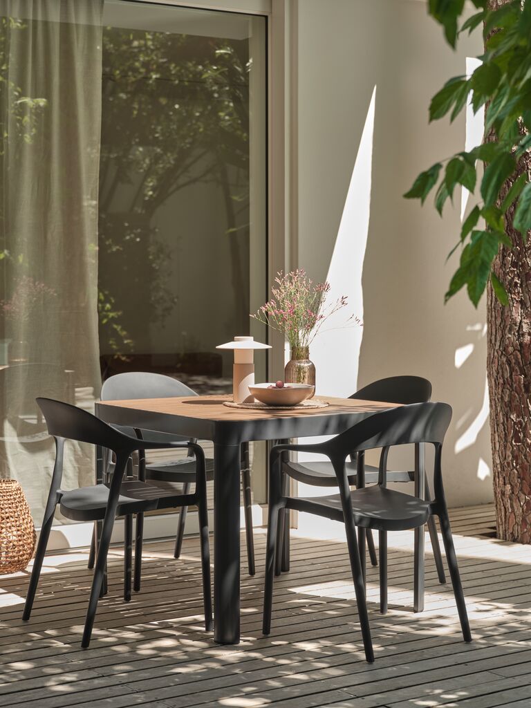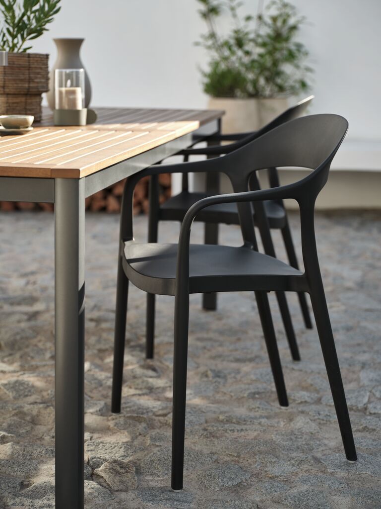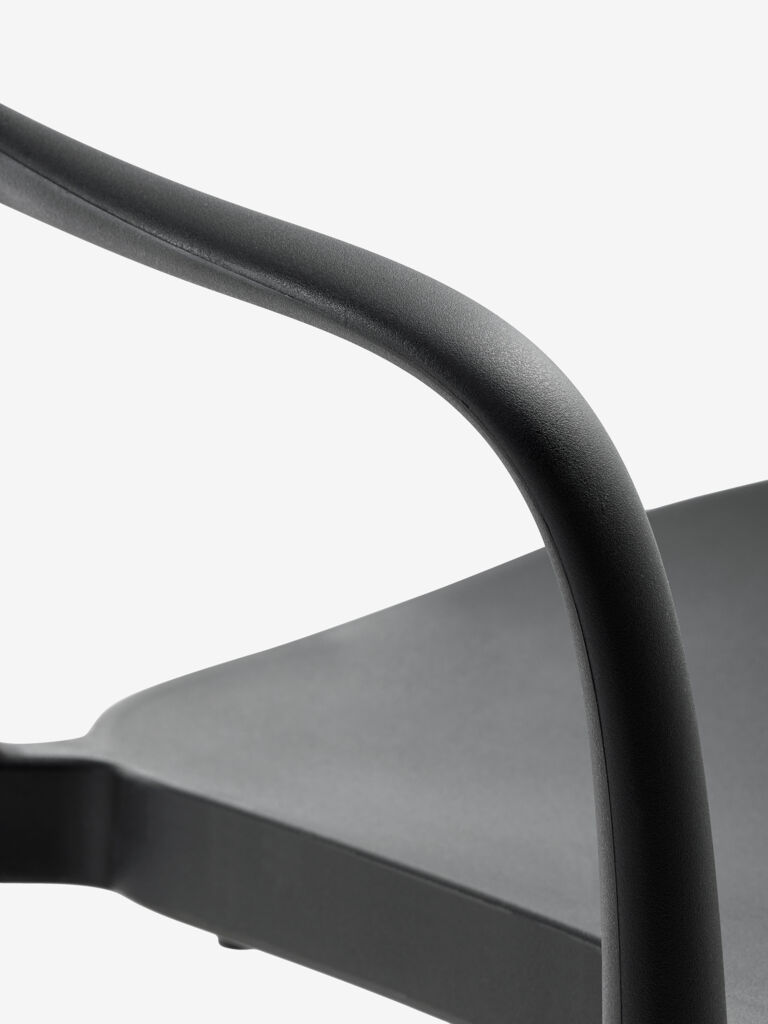 Silla apilable de color gris oscuro, de plástico protegido contra los rayos UV, lo cual contribuye a prevenir el desteñido. Esta silla de jardín es apilable, para un almacenaje compacto.
