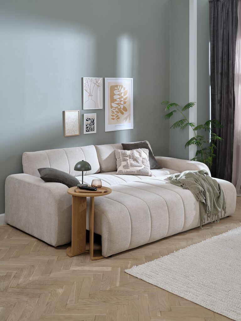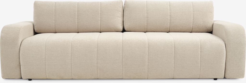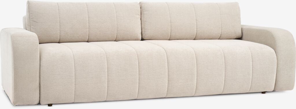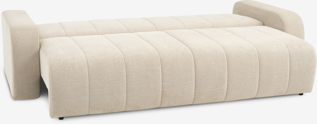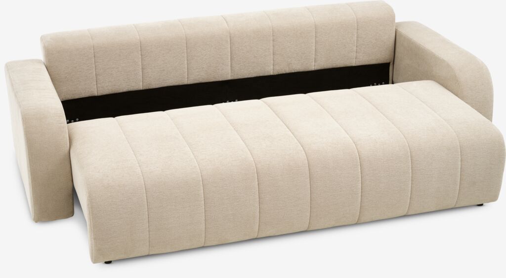 Sofá de 3 plazas de tela. El sofá se convierte fácilmente en una cama. Cojín de asiento con muelles ensacados y acolchado de espuma de alta resiliencia. Cojín de respaldo de espuma. Con espacio de almacenaje. Superficie para dormir: 150x195 cm. A240 x A78 x P107 cm